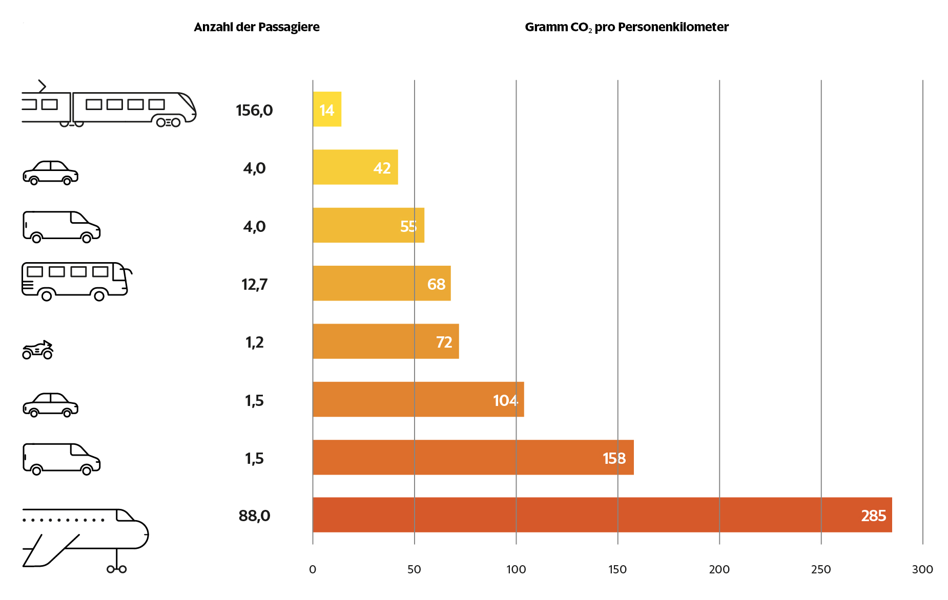 Züge sind eindeutig führend in Sachen Umweltfreundlichkeit. Während der Verkehr in der Europäischen Union immer mehr CO2 erzeugt, macht der Schienenverkehr nur 0,5% davon aus und ist langfristig rückläufig. Auf der anderen Seite besteht der ständig wachsende Bedarf an Lufttransporten. Die umweltfreundlichsten Züge sind die elektrischen, bei denen CO2 durch die Erzeugung von verbrauchtem Strom entsteht, während des Betriebs dann gar nicht.