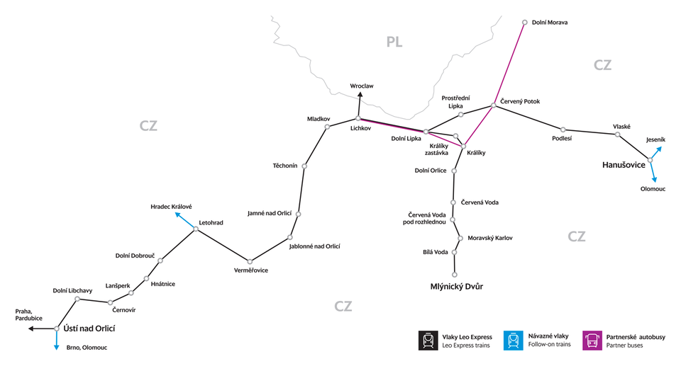 At stations in Letohrad, Jablonné and Králíky you can buy a ticket at Leo Express ticket offices. At other stations and stops you can buy a ticket from a conductor on a train. Tickets in the IREDO tariff can be bought in any other place where these tickets are sold (including ČD cash desks).