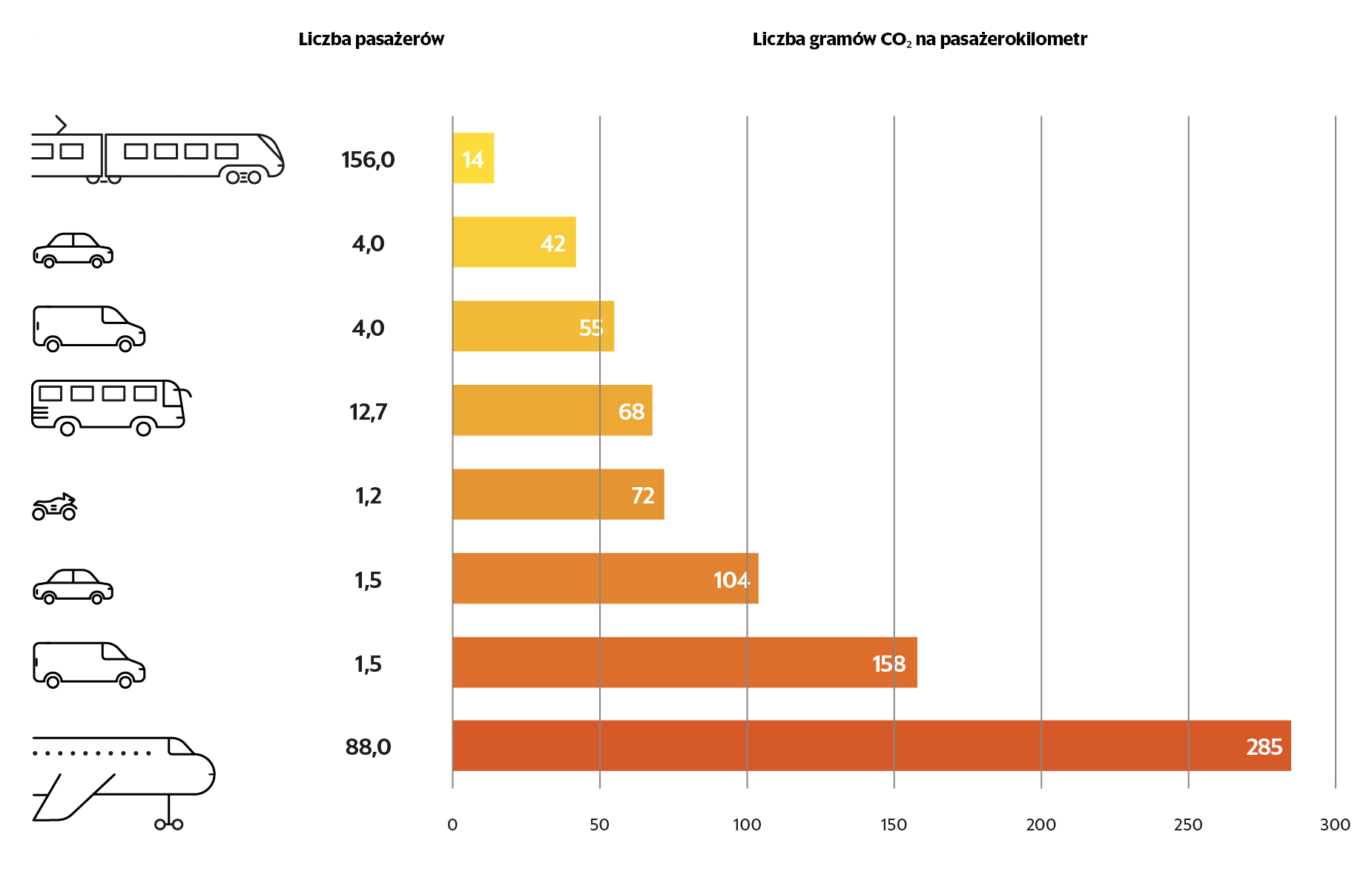 Pociągi są wyraźnym liderem pod względem przyjazności dla środowiska. Podczas gdy transport w Unii Europejskiej generuje rosnące ilości CO2, transport kolejowy stanowi zaledwie 0,5% całości i w dłuższej perspektywie ciągle spada. Z drugiej strony transport lotniczy stale się rozwija. Najbardziej zielone pociągi to elektryczne, w których CO2 jest wytwarzany przez produkcję energii elektrycznej, gdzie podczas samej jazdy wcale.
