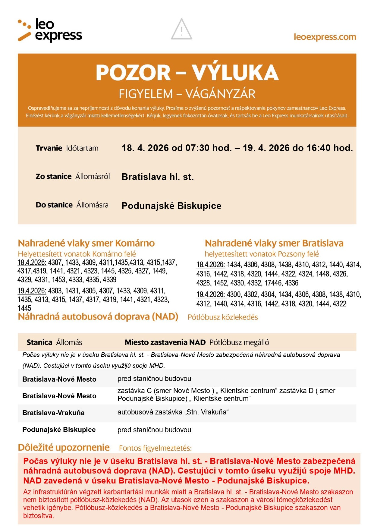 Výluka Bratislava-hl.st. - Podunajské Biskupice 18.–19. 4. 2026