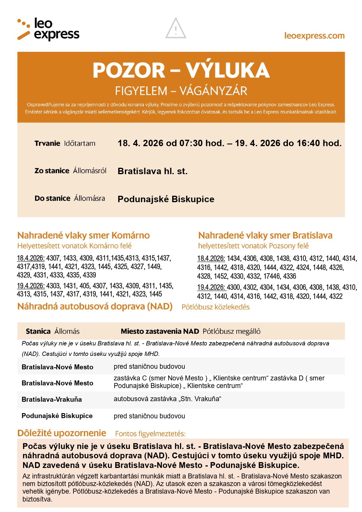 Výluka Bratislava-hl.st. - Podunajské Biskupice 18.–19. 4. 2026
