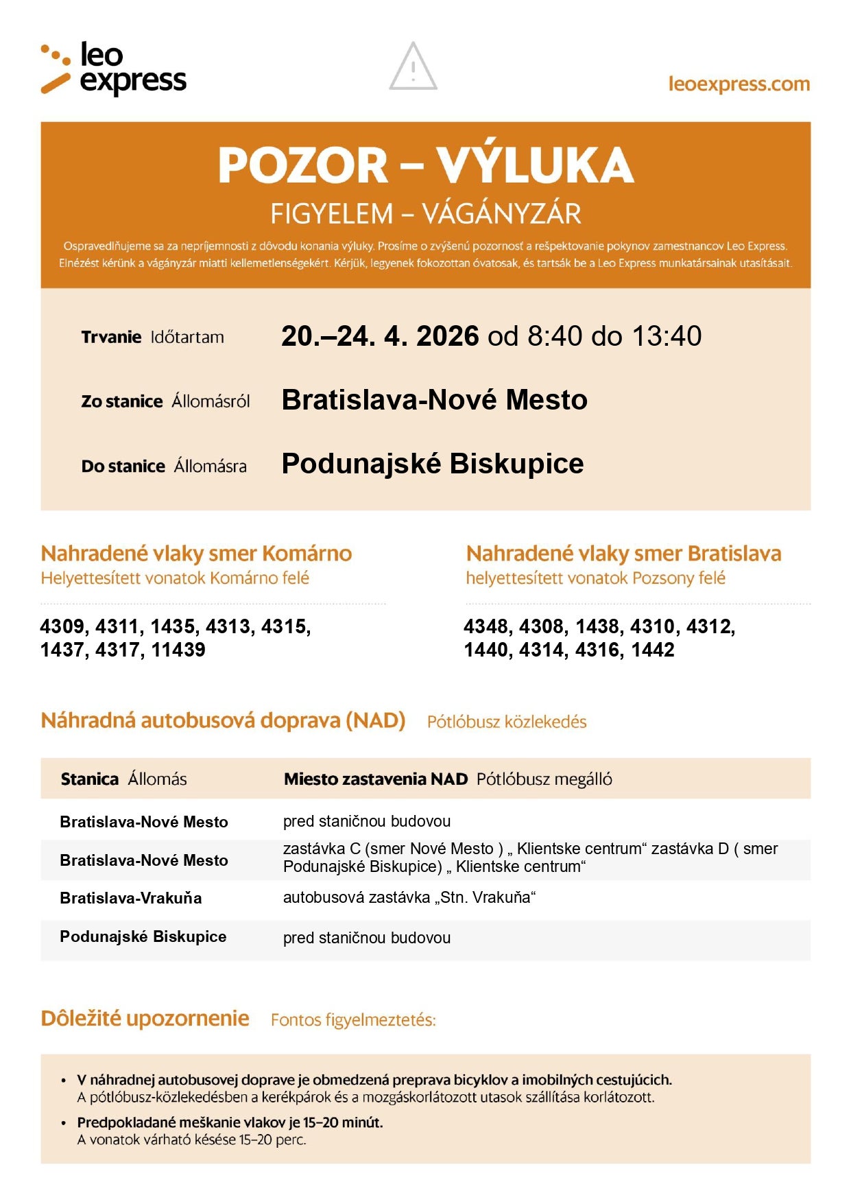 Výluka Bratislava-Nové Mesto - Podunajské Biskupice 20.–24. 4. 2026